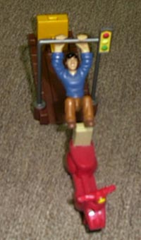 バイクがスプリングで飛び出すと、ジャッキーが信号のパイプにつかまってエスケープする。