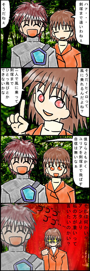 おそらくこれは本編終了後ですね。 いや、本編とは関係無いんですけど。 そしてわかると思いますが、ヒイロはコピペです。 ヒイロはずっとこの顔がいいかなと思ったからであって、 決してさぼった訳ではなく…… いや、本当なんですってば。 (2004/4/3UP)