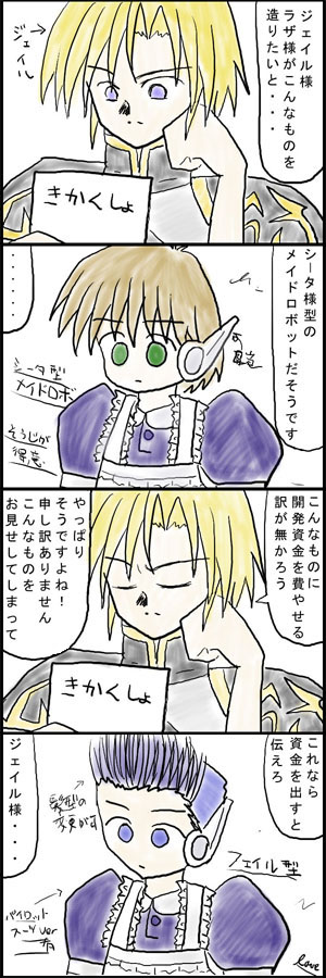 いわずもがなですが、 耳当ては例のアノ作品の耳当てをモデルにしてます。 ジェイル様は初めてビジュアル化しましたが…… もっと美形で冷たいカンジがする人なんです。 画力不足ですいません。 (2004/4/3UP)