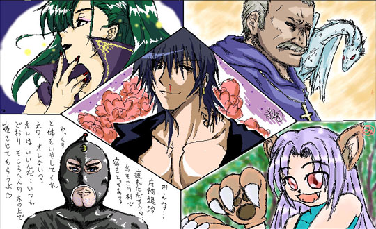 剣士(♂)@山狗さん(中心)、諜報部員(?)@RYUUさん(左下)、獣人(♀)@美奈神(右下)