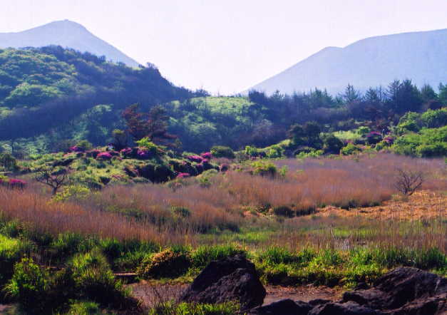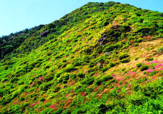 斜面を彩るピンクのミヤマキリシマ