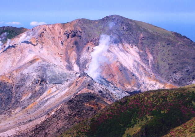 三俣南峰山頂から見た硫黄山の噴気