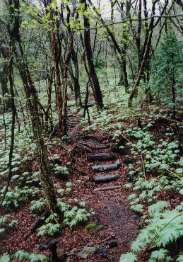 雨は山頂まで降り続き、東峰では強風も加わる。山頂は素通りして足早に正面登山道を下る。下るに従い雨は弱くなり、日向観察路に入るころには止んでいた。日向観察路はまさに森の中。苔むした岩と立ち並ぶ木々、新緑のなか霧が漂い神秘的だ。足元を見れば、スミレやヤマエンゴサク、フウロケマンなどの花が所々咲いていて、居心地のいい森の中歩みも遅くなる。新緑の森を満喫し、猪ノ瀬戸登山口へと戻る。