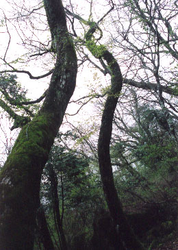奇妙に幹をよじる苔むした木 |
